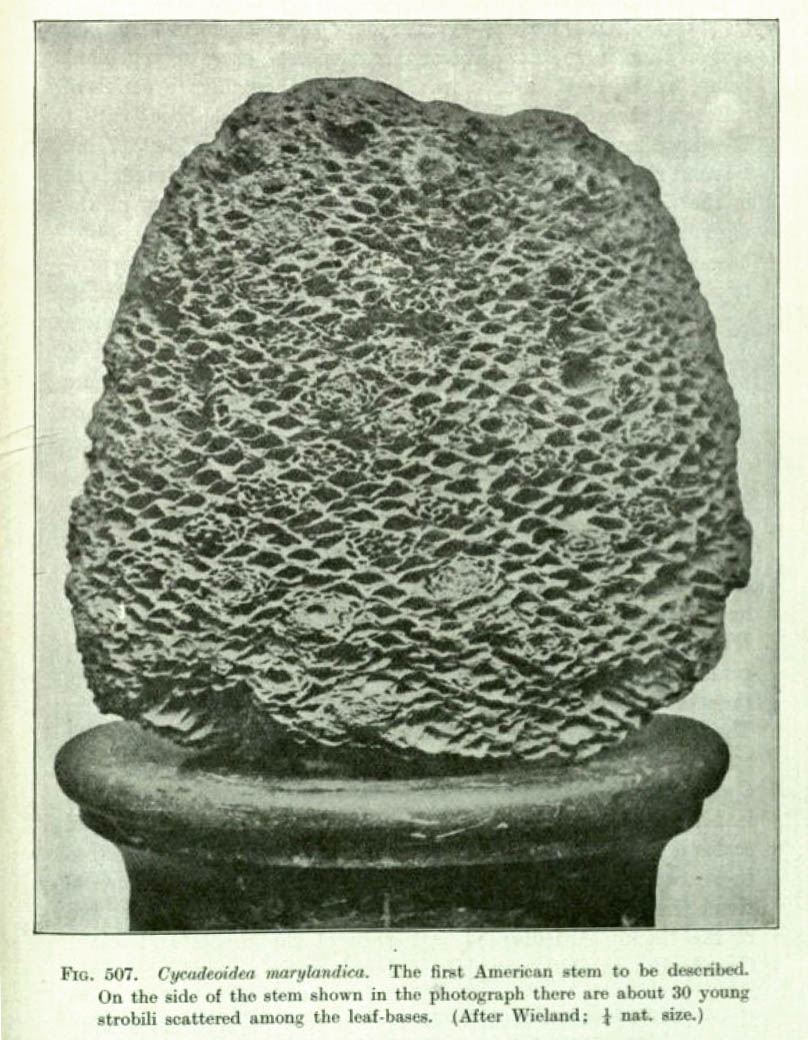 Excellent illustrations of bennettite trunks, showing the rhomboidal leaf scars, from Carruthers, 1870.