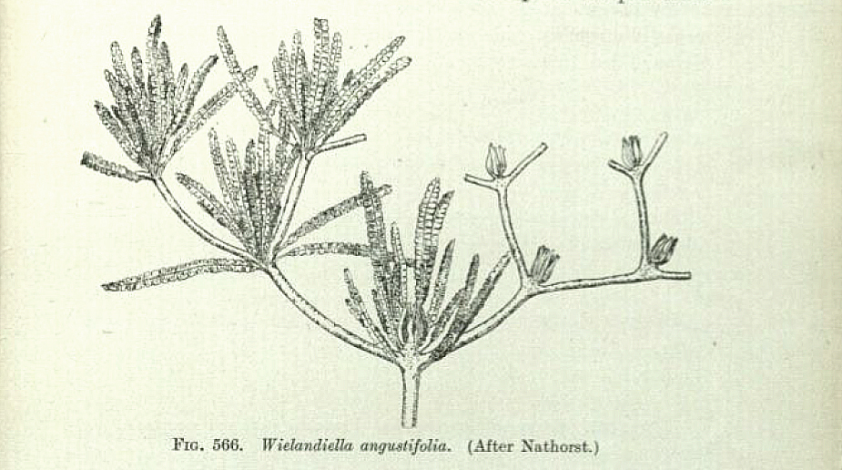 One common type of slender – stemmed bennettite is exemplified by Wielandiella. It branches every few centimeters and there are crowns of Anomozamites – type leaves and one cone in each fork. In a weird way the familiar little spiral terminal leaf crowns have just multiplied many times and moved into in the forks of many slender stems. This plant was described by Nathorst in 1902 but, a century later, Anomozamites haifanggouensis was found with clusters of small, oval, male cones dangling from the same leaf crowns. This plant is from Middle Jurassic Daohugou, but it is from the Jiulongshan Formation, underneath the Tiaojishan Formation.[3]