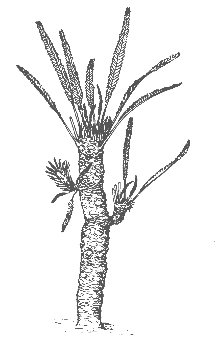 The last main habit category is much more branched and slender, and this is where things get a bit more complicated. No whole plant fossils are known for this category but we have a great deal of fragmentary evidence. There are authors who suggest that some of these plants (Sahnioxylon)[1] could have been 25 meter tall trees with trunks 30 cm in diameter or more. Authors also think some of these bennettites, like Rehezamites, were shrubby like the modern cycads Bowenia serrulata, Zamia restrepoi, and Macrozamia fawcetti[2].
