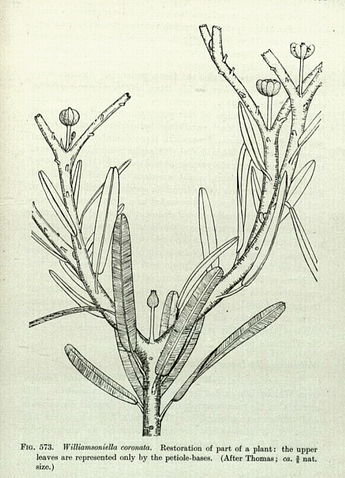 The final branched bennettite I’ll mention is Williamsoniella coronata, from Jurassic England. It is strictly dichasial and has 2 cm cones in the forks of the stems, but it no longer retains the spiral leaf crowns. Its leaves (Nilssoniopteris – type) are distributed quite widely along the stems, and they leave small leaf scars when they drop off. With this sort of leaf pattern the plant may have looked like shrubby, less columnar, forms of Podocarpus macrophyllus.