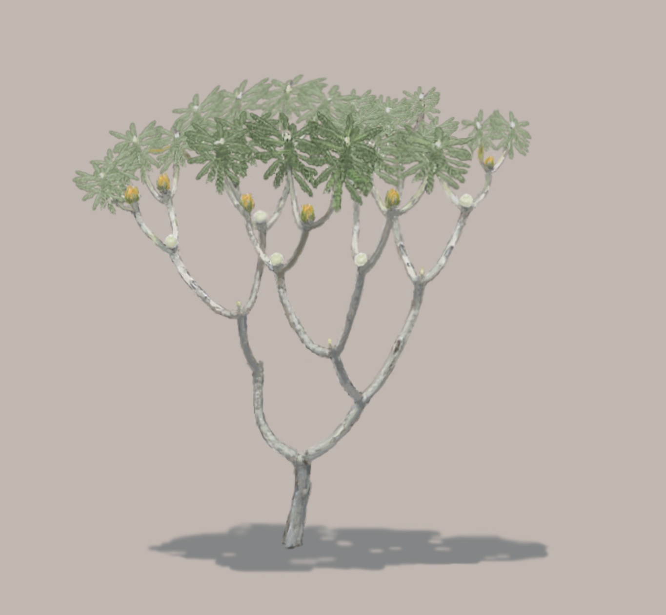 Pott demonstrates that bennettites display a branching pattern known as divarication. Divaricating plants have arisen independently in different plant families and habitats, and the literature and debate on them is fascinating. Explanations for a divaricating growth habit include adaptation to glaciers, efficiency of light – harvesting, and others. Divaricating plants are still most common in New Zealand, where the giant moa went extinct just 600 years ago, and Madagascar, where the elephant birds went extinct 300 or 400 years ago. These are very different climates, one is cool / temperate and postglacial while the other is tropical and seasonally dry, suggesting that climate and glaciers are not the common factor.