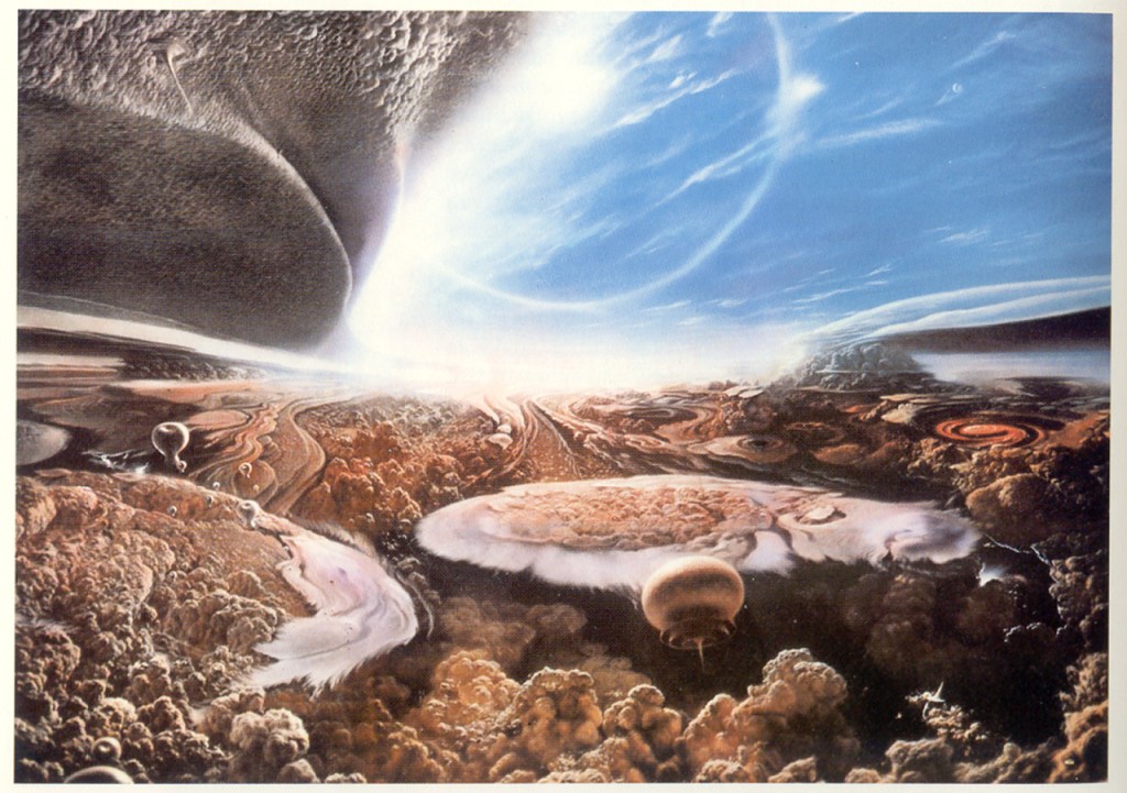 1. I can easily imagine non-bilateral organisms performing at higher levels of speed, endurance, and maneuverability than bilateral competitors. I can picture marine habitats where apex predators look like giant paramecia with big sensor clusters and routinely sweep up swarms of little jawless fish-like bilaterals in their maws. On land I can picture giant amoeboid creatures running on numerous pseudopods and grabbing slow amphibian-like bilaterals. And in Carl Sagan’s famous book COSMOS the artist Adolf Shaller depicted life in the clouds of Jupiter. It all appears to be radial organisms, buoyed by hydrogen gas balloons. In the lower right is a falcon-like predator that has shed its balloon and is now gliding in to attack a much larger prey organism. It is plausibly radial.
