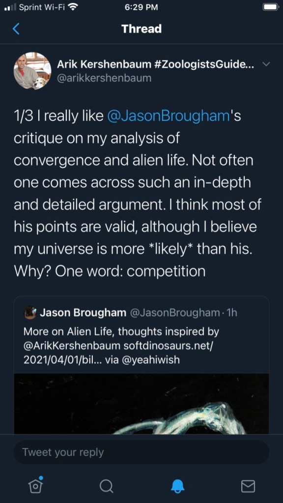 2. It is true that, in the history of very large organisms on land and in the air on earth, bilaterals were clear favorites. That could possibly be inevitable but it could also be a thing that happened just by chance, as a series of contingent events in evolution. It didn’t happen at all – there were no land or flying animals at all – for the first 90% of life’s history on earth, with the first animals inhabiting the land 415 million years ago or so. To many that suggests it wasn’t inevitable. Moreover, there is a much bigger radiation of much more diverse organisms, where competition was super intense and no bilaterals ever arose at all. Protists. Camera like eyes did arise in protists, lending support to Simon Conway Morris’ conjecture that eye structures with lenses and retinas will be universally favored by natural selection. But those eyes are found on asymmetrical organisms. The evidence from protist evolution seems to me to suggest that bilateralness is not at all the automatic winner in evolutionary competition. I know that the doctor is thinking mostly about alien life that could give rise to intelligent species but I think that protists could have generated intelligence. Many protist lineages gave rise to colonial forms, including giant kelp (and also, one more step removed, us). I can imagine making contact one day with an intelligent species something like kelp, that have their nervous systems distributed over a huge network of cell-like units covering an area as large as a kelp forest. There has even been theoretical speculation that very exotic life forms could achieve technological intelligence while remaining at the microbial scale (or so it was claimed in the novel The Andromeda Strain).