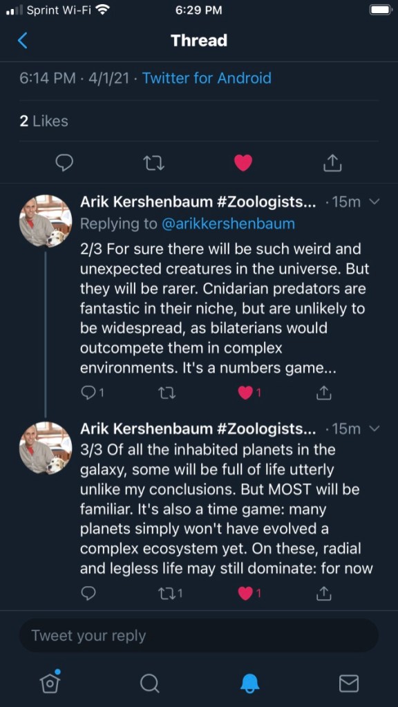 Carl Sagan made good point about the search for intelligent alien life. At present the only practical way we have of contacting another intelligent species is radio communications. So if we ever do find an alien intelligence we can be confident we will have at least one thing to talk about: radio astronomy. But even then I don’t think that requires a bunch of alien radio technicians sitting around oscilloscopes under a steel radio antenna. They could be crystalline organisms that transmit radio from their bodies and whose minds work in ways that are incomprehensibly alien to us. I am sure that Dr Arik Kershenbaum and I would be equally and utterly thrilled to get to see what, if any, alien life forms exist on other planets, moons and asteroid belts, and we both know that is highly unlikely in our lifetimes or the near future of the human race. One day, though, humans may get their minds blown by something we find out there.