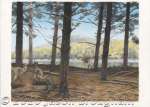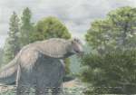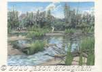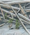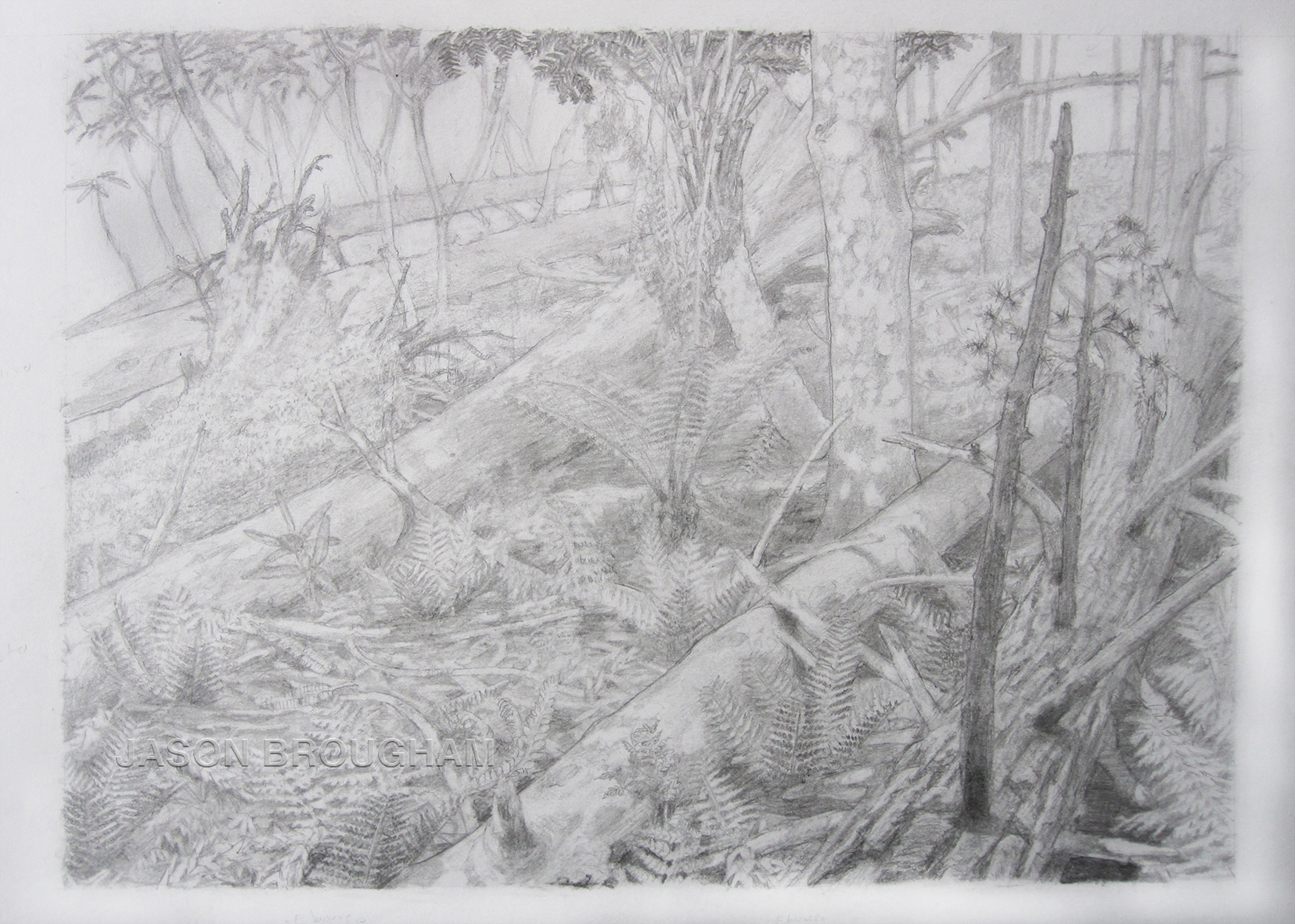 Forest floor, Yixian Formation, Early Cretaceous, Liaoning China. On this shallow, eroding, slope the canopy trees (Pityocladus/Schizolepis: seen as fallen log with attached leaves all the way to right, Baiera, Liaoningocladus) have been frequently disturbed, and pioneers like tree ferns (Cladophlebis spp.) and bennettites (Tyrmia acrodonta) have sprung up. The understory includes the ferns Eboracia lobifolia, Coniopteris burejensis, Bortrychites reheensis, and the moss Muscites tenellus.