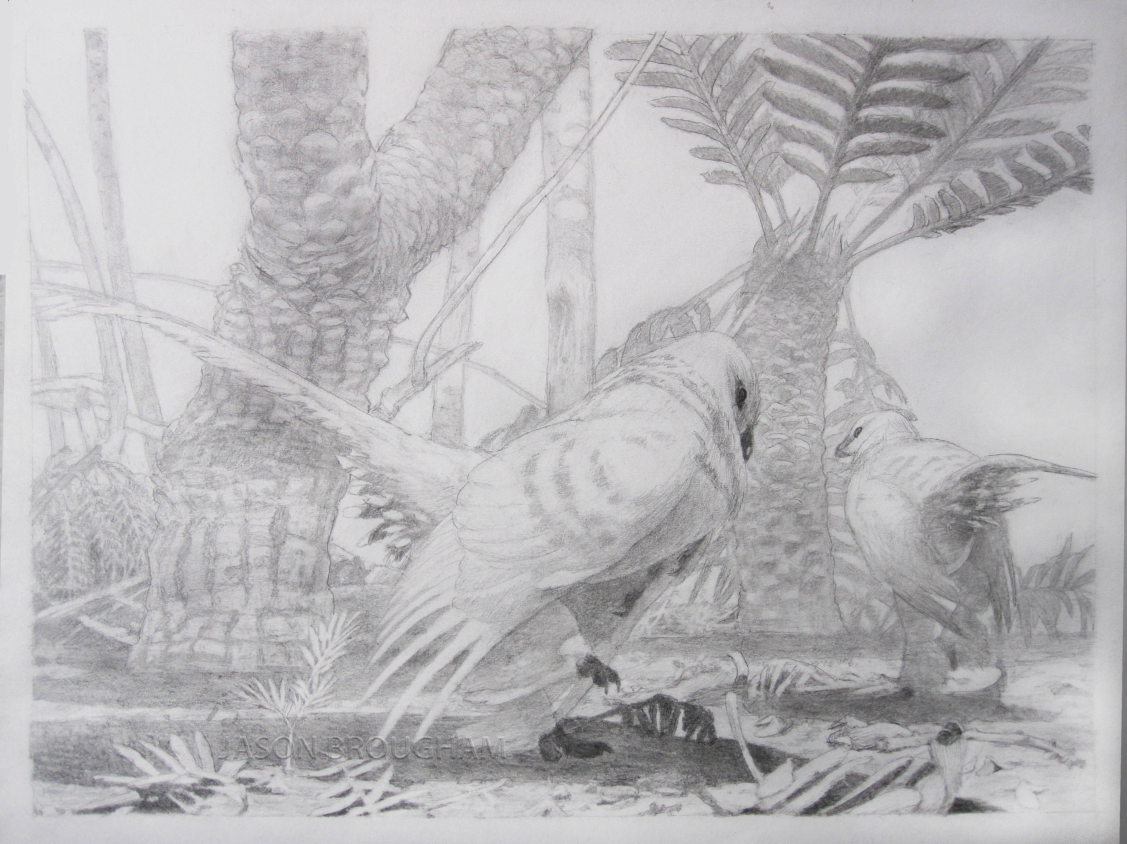 Here are a pair of Aurornis xui, the male displaying to the female. This is from the Tiaojishan Formation, Late Jurassic, Liaoning China. It is a seasonally dry woodland dominated by bennettites and cycads. To the left is Pterophyllum festum, an arborescent bennettite. The trunk is Bucklandia type. To the right is the cycad Ctenis leeiana. The leaf litter includes both and also Schizolepis sp. and Cycadolepis sp.