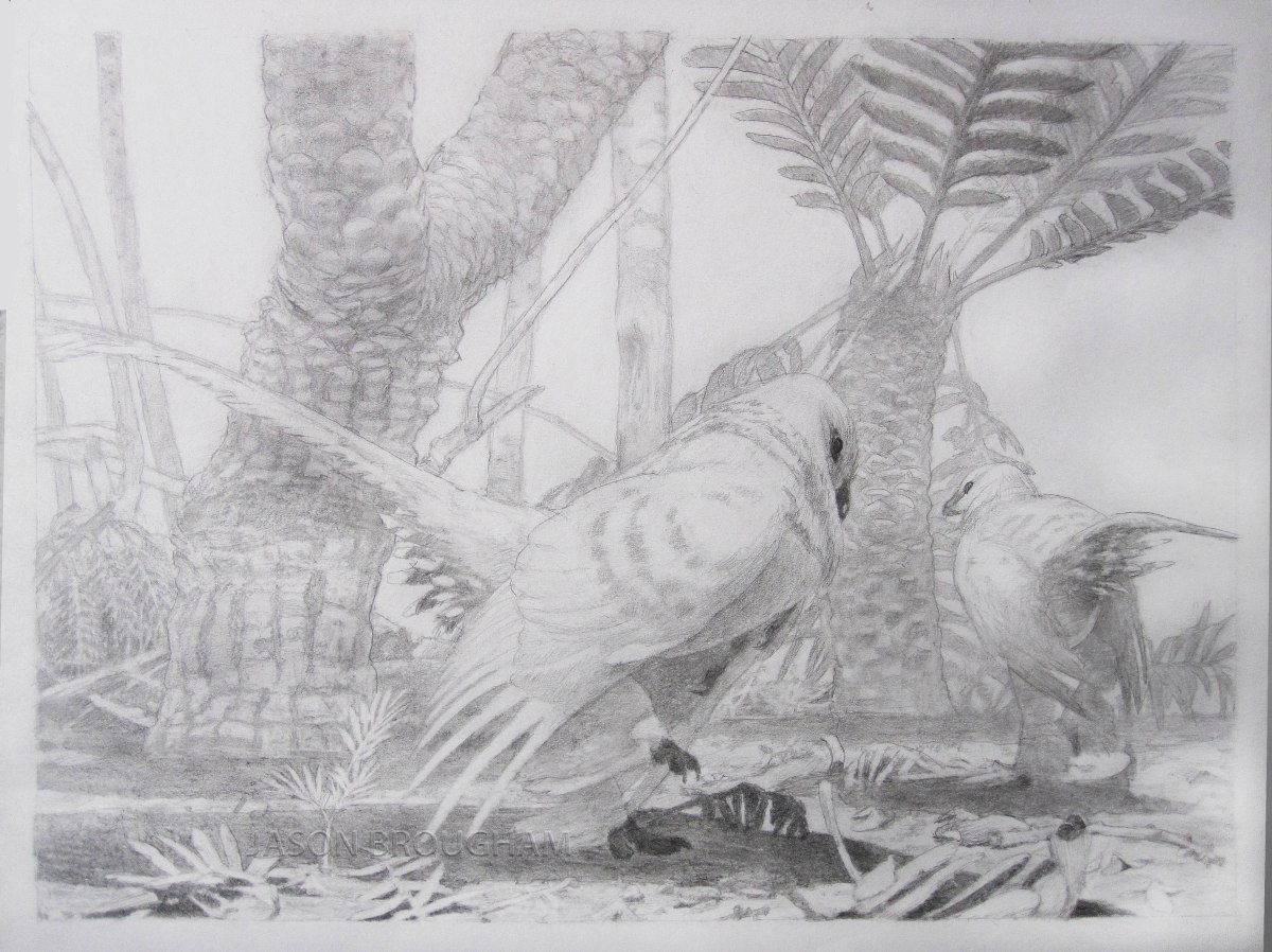 Here are a pair of Aurornis xui, the male displaying to the female. This is from the Tiaojishan Formation, Late Jurassic, Liaoning China. To the left is Pterophyllum festum, an arborescent bennettite. To the right is Ctenis leeiana. The leaf litter includes both and also Schizolepis sp. and Cycadolepis sp.