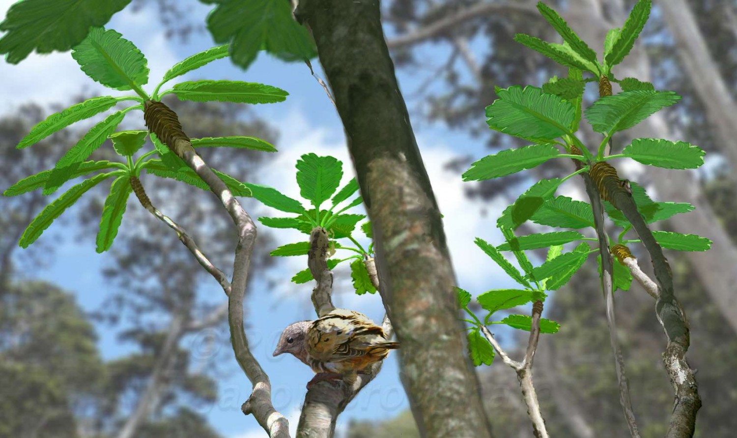 the bennettite Baikalophyllum with a fledgling enantiornithine, based on GMV 2158 (formerly Liaoxiornis).